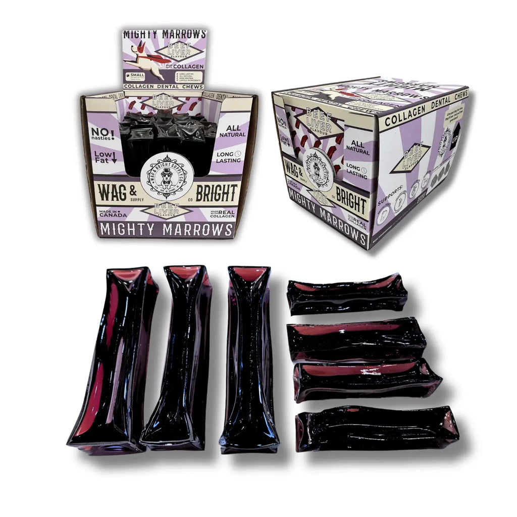 Mighty Marrows Collagen Dental chews are a delicious, nutritious way to support your dog's oral health. Each super long lasting chew is designed to naturally clean teeth, reduce plaque, and freshen breath, all while being gentle on your dog's gums.